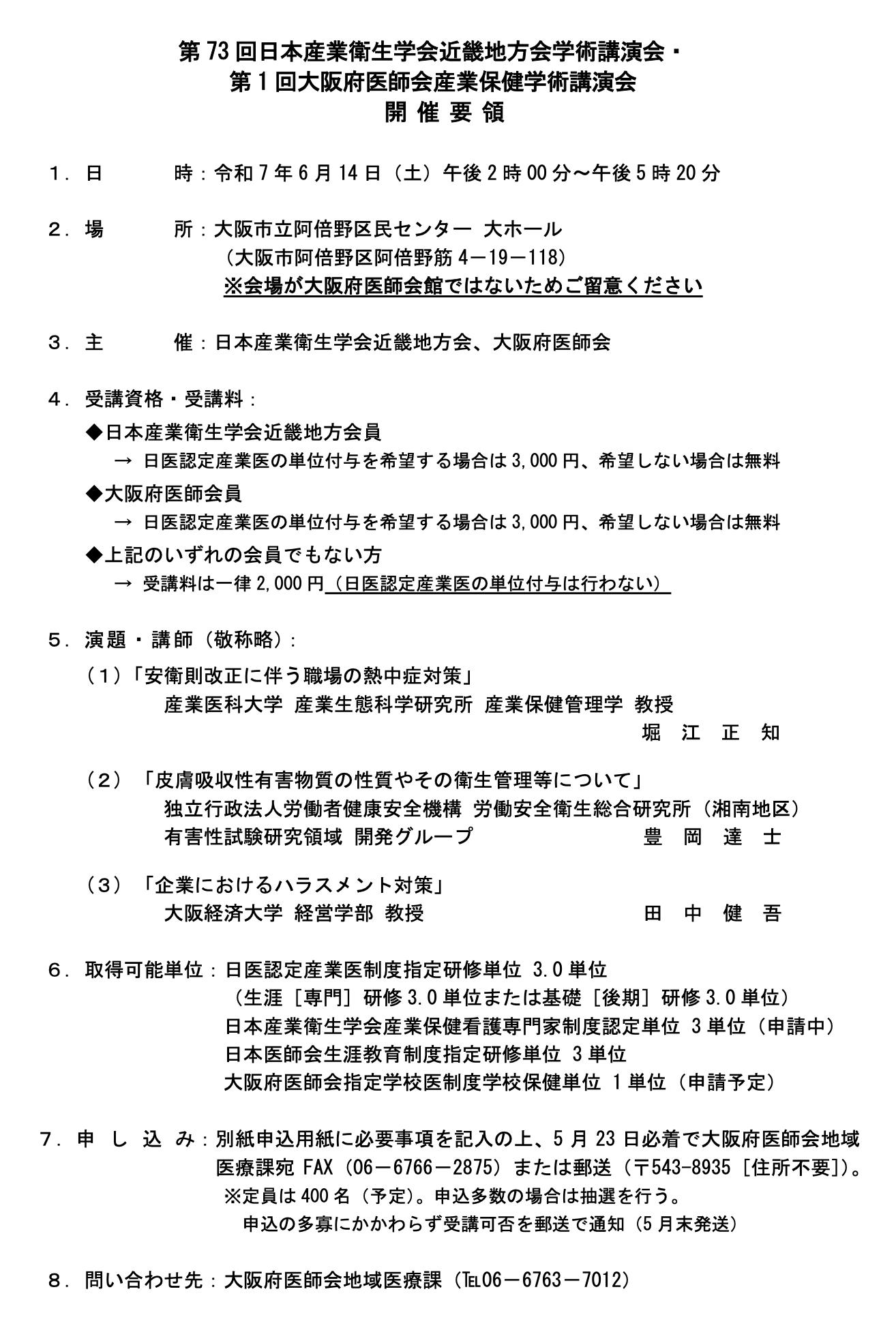第73回日本産業衛生学会近畿地方会学術講演会・ 第1回大阪府医師会産業保健学術講演会