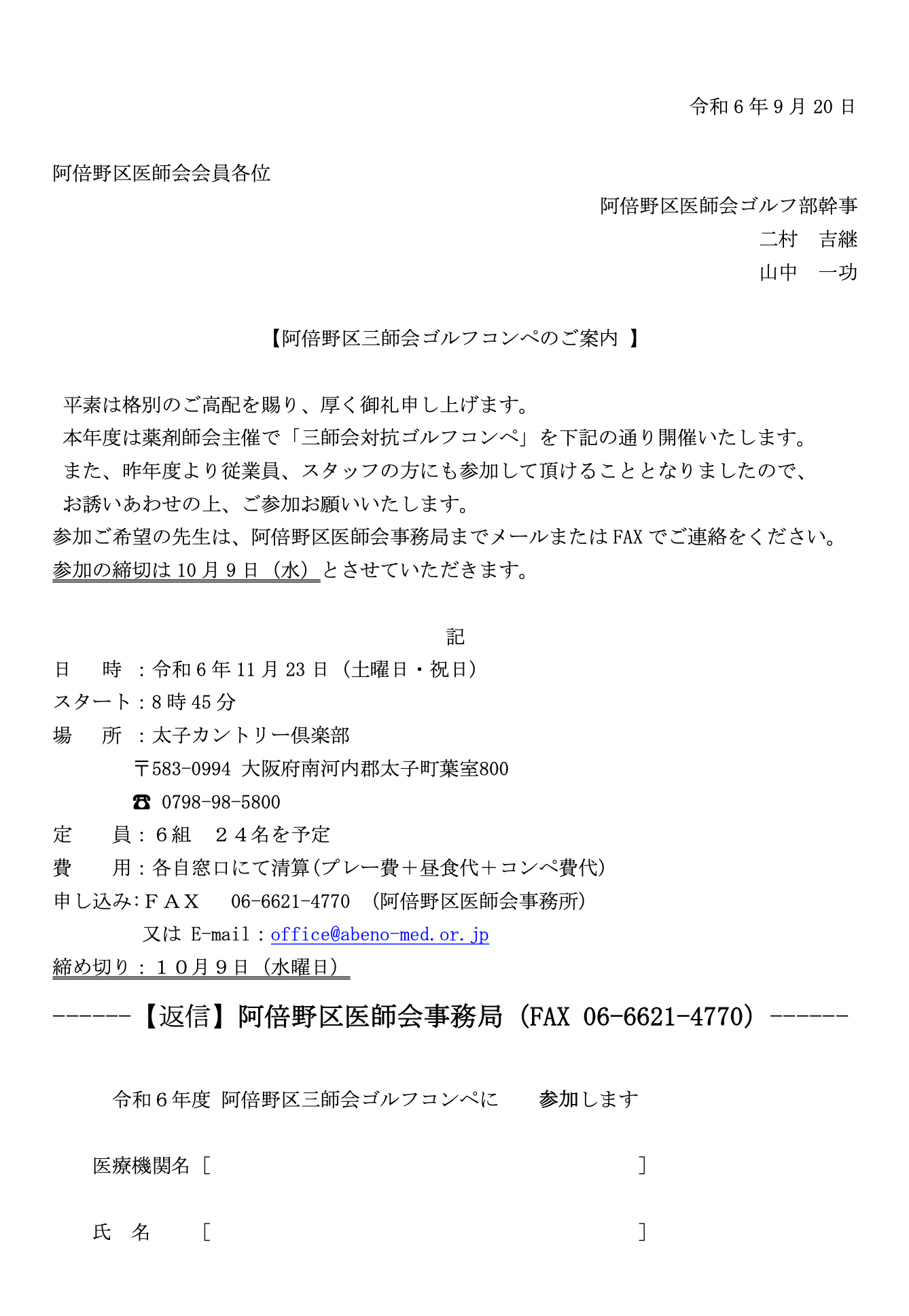 令和6年度 阿倍野区三師会ゴルフコンペ開催案内